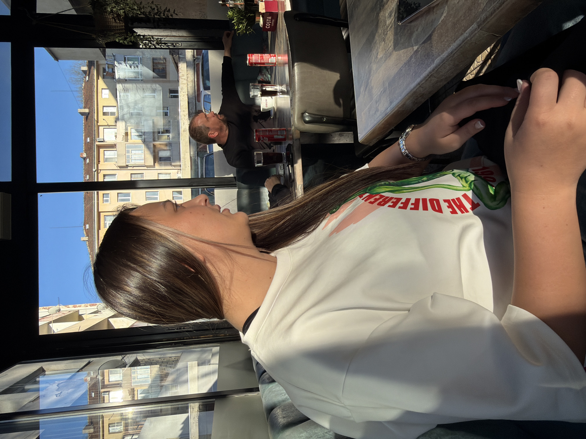 A medium indoor shot features two individuals seated at a table within a restaurant setting in Pernik, Bulgaria. One person, a fair-skinned woman with long brown hair, is predominantly in the foreground, wearing a white shirt with red lettering. Her hands are visible on the table, one adorned with a silver bracelet and painted fingernails. Across the table, an older man with a shaved head and wearing a black shirt sits facing away from the camera. A window behind him reveals a cityscape reflecting buildings under a clear blue sky. Several cans and glasses labeled "Costa" are positioned on the table. The table has a textured, faux wood surface. The light source seems natural and direct, casting strong shadows. The interior includes a dark-colored seating area.