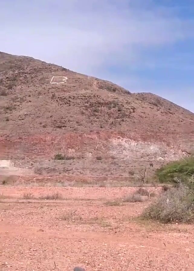 The video depicts a dry, dusty landscape. The foreground is a field of reddish-brown dirt with sparse, dry vegetation. A small dark rock is visible at the bottom of the frame. In the background, a large hill dominates the scene. The hill is mostly brown and tan, with a visible layer of red soil in the middle. On the upper part of the hill, there is a white shape, possibly painted or formed by stones. The sky above is blue with scattered white clouds. The camera appears to be stationary, providing a wide shot of the landscape. The video has the watermark "Infinix SMART 6" at the bottom.
