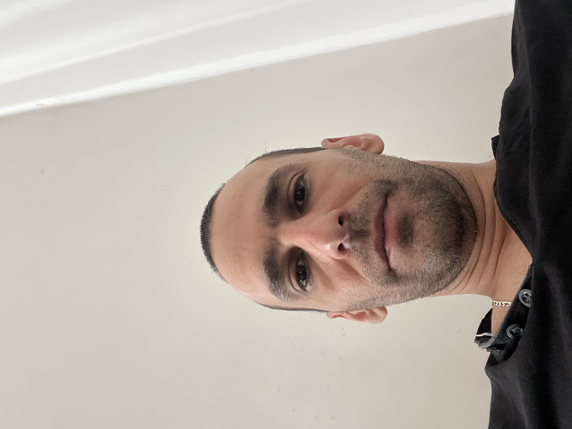 A low-angle, head-and-shoulders portrait depicts an adult male against a plain, light-colored indoor background. The male, estimated to be in his 30s to 40s, has short dark hair and dark eyes, with light stubble covering his lower face. He is wearing a dark-colored collared shirt, possibly a Henley or polo, with several buttons visible at the collar. A silver-toned chain is partially visible around his neck. The subject is looking directly into the camera with a neutral expression. The background consists of a smooth, off-white wall on the left, and a vertical white element with faint creases, possibly a curtain or structural feature, on the right. The scene is set indoors. The exact location within Schaerbeek - Schaarbeek, Belgium, is not discernible from the visual information presented.