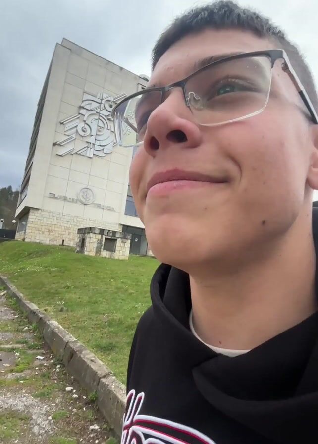 young man with short dark hair, wearing glasses and a black hoodie, standing outside on a cloudy day. Behind him is a tall, light-colored building with a large symbol on its facade. There is grass and a concrete walkway between him and the building. He is looking slightly upwards and to his right, with a smile on his face. The camera seems to be held close to him, capturing a selfie perspective.