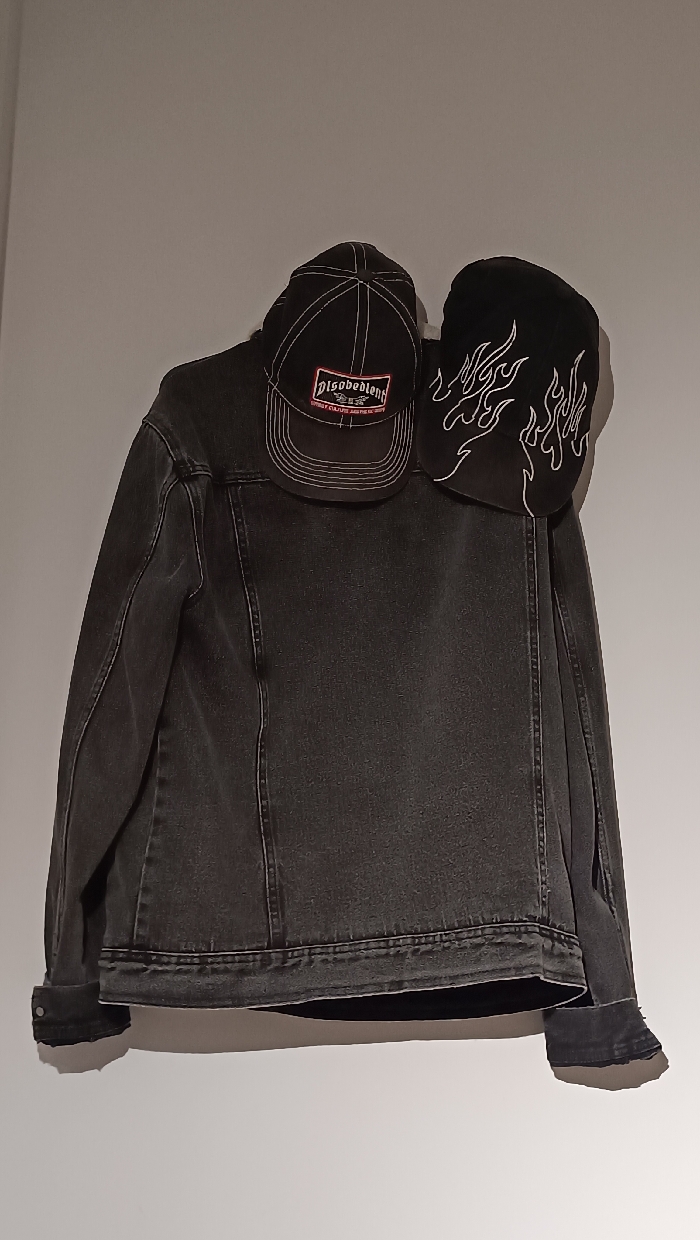 The scene takes place in Sabadell, Spain. Three dark-colored clothing items are suspended against a plain, light-colored wall. A black denim jacket with visible white contrast stitching and vertical seam lines is centered in the frame, hanging flat. Resting on the upper portion of the jacket are two headwear items. To the viewer's left, a black baseball cap with white stitching features a red and white rectangular patch on its front, displaying "DISOBEDIENT" in white text with "STREET CULTURE AESTHETIC" in smaller text below. To the right of the baseball cap, a black knit beanie is positioned, adorned with white embroidered flame motifs across its visible surface. No individuals are present. The environment is a uniform, unadorned wall, suggesting an indoor setting.