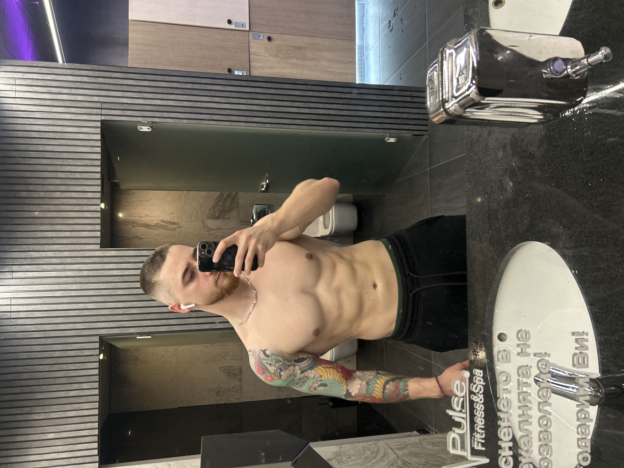 An adult male is depicted from the waist up, taking a mirror selfie within what is identified as a Pulse Fitness&Spa facility in Sofia, Bulgaria. The man has a short-cropped haircut, a reddish-brown beard, and wears a silver chain necklace and a white wireless earbud in his right ear. He is shirtless, revealing a muscular physique with visible abdominal definition. His left arm is extensively covered with a colorful, intricate tattoo depicting an Asian-style dragon and other motifs. He holds a black smartphone with multiple camera lenses in his right hand, pointing it towards the mirror. The reflection in the mirror reveals a modern locker room or restroom environment. The background features dark, vertically paneled walls. To the left, a frosted glass door is slightly ajar, opening into an area with light-colored tiled walls and a visible white toilet bowl. To the right, a series of light wooden locker doors, some marked with "M-2" and "M-4", are visible, indicating a locker room. The floor is dark-tiled and appears to have scattered water droplets. Overhead lighting is present, and a strip of purple ambient light is seen in the upper right background. In the immediate foreground, reflected on the mirror surface, is a dark countertop with an integrated white oval sink and a chrome faucet. A chrome, wall-mounted soap dispenser is also visible to the right of the sink. The "Pulse Fitness&Spa" logo is clearly discernible on the mirror, along with Cyrillic text that translates to "Photography in the changing room is not allowed! Thank you!", confirming the precise location and context of the image.