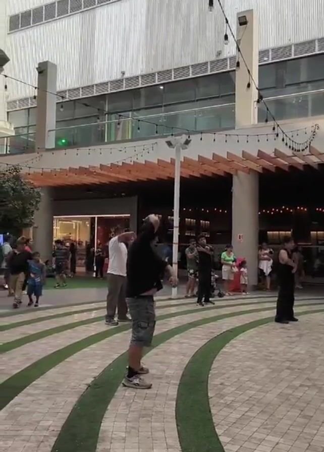 group of people seemingly practicing a dance in an outdoor plaza. There are about 8-10 individuals spaced apart, dressed in casual attire. They are performing synchronized arm movements. The plaza has a patterned brick floor with curved green inlays, and is surrounded by modern buildings with retail spaces. String lights hang above, adding to the atmosphere. Several other people are walking by or observing the dance practice. The weather appears to be sunny.