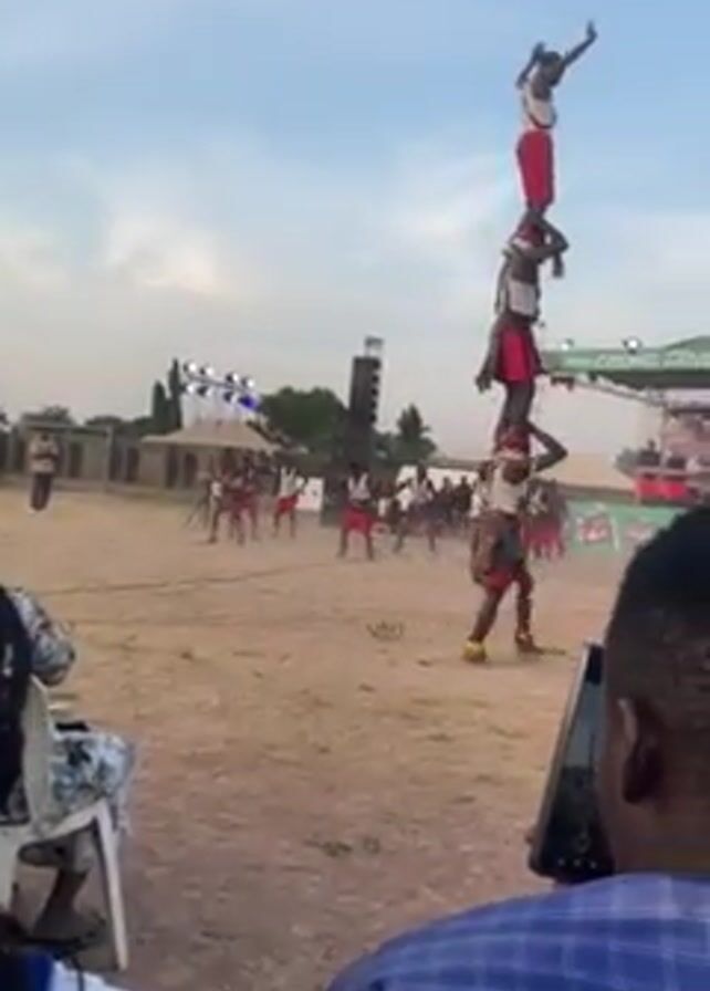 A video shows a group of performers forming a human pyramid in a field. Four men, dressed in matching red and white outfits, are stacked atop each other. The top man is upside down, balanced on his hands. Around them, several other performers are dancing in a circle. A crowd watches from chairs, tents and speakers are visible in the background. The sky is overcast.