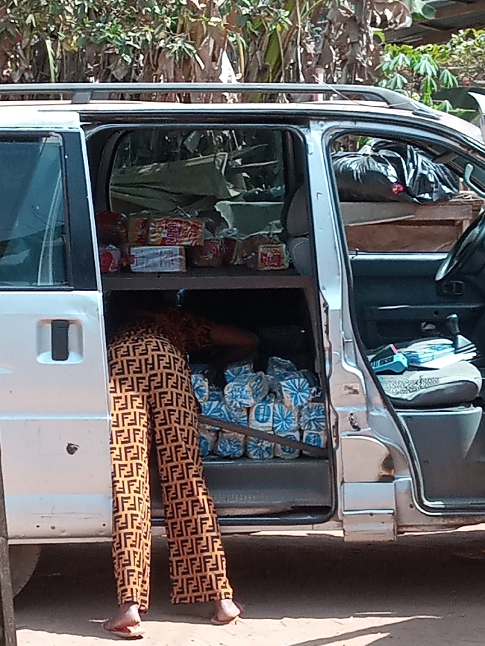 The scene in Okpatu-Ukehe, Nigeria depicts a silver-colored van or minivan with both its passenger-side sliding door and front driver's door open. The rear passenger compartment of the vehicle has been repurposed, featuring a horizontal shelf. On the upper shelf, multiple packaged loaves of bread, some identifiable with "CUBANO" branding, are stacked. Below this shelf, a substantial quantity of smaller, cubic items, each individually wrapped in white and blue patterned plastic, are stacked. A wooden rod is visible horizontally among these lower packages. A person, visible from the waist down, is bent over and reaching into the lower section of the van's cargo area. This individual wears wide-leg trousers featuring a repeating brown and black "Fendi" logo pattern and light-colored flip-flops. The driver's side of the van shows the steering wheel and a seat covered with a patterned fabric, upon which a blue object and other items are placed. The background consists of dense green foliage, suggesting a lush outdoor environment. The ground beneath the vehicle appears to be dirt or sand.