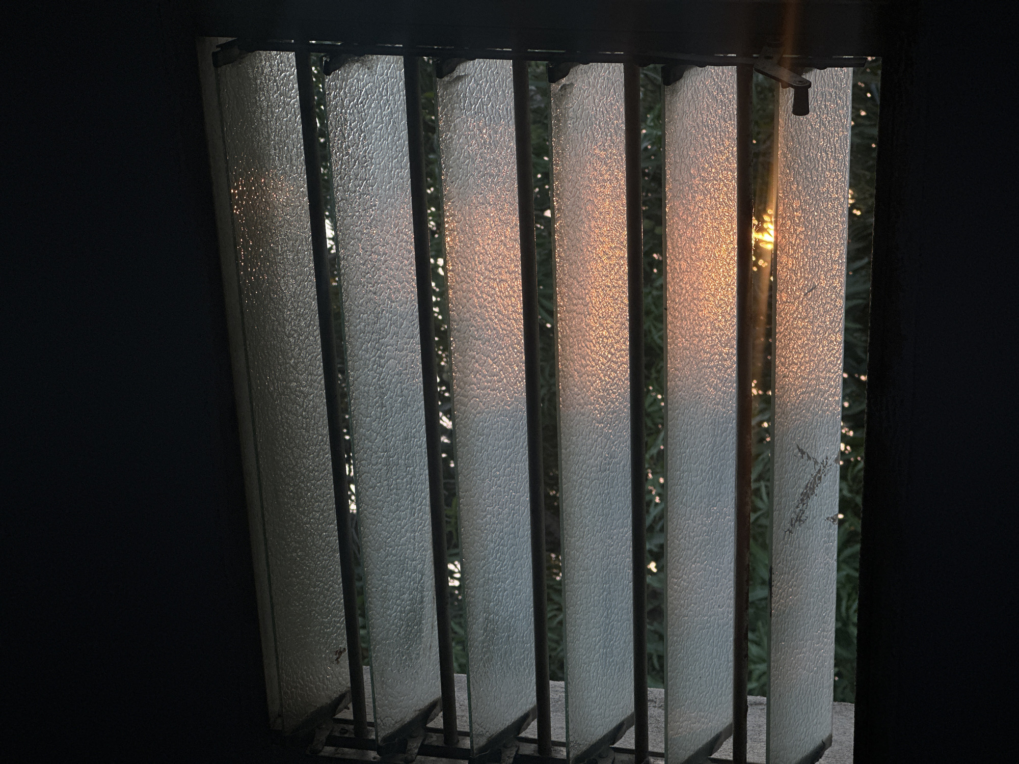 The image displays a louvered window viewed from an interior location in Tinaquillo, Venezuela. The window features approximately eight horizontal panes of textured, translucent glass, secured within a dark-colored metal frame. Bright, warm-toned natural light, consistent with sunlight, originates from the exterior, illuminating the glass surfaces with an orange-yellow hue, particularly noticeable on the lower-right louvers. Reflections and refractions of this light create numerous small, bright points across the textured glass. Beyond the window's structure, obscured by the louvers, is an outdoor environment containing discernible green foliage. The immediate interior area surrounding the window is dark, contrasting with the illuminated exterior. No individuals, specific actions, or other significant objects are present within the frame.