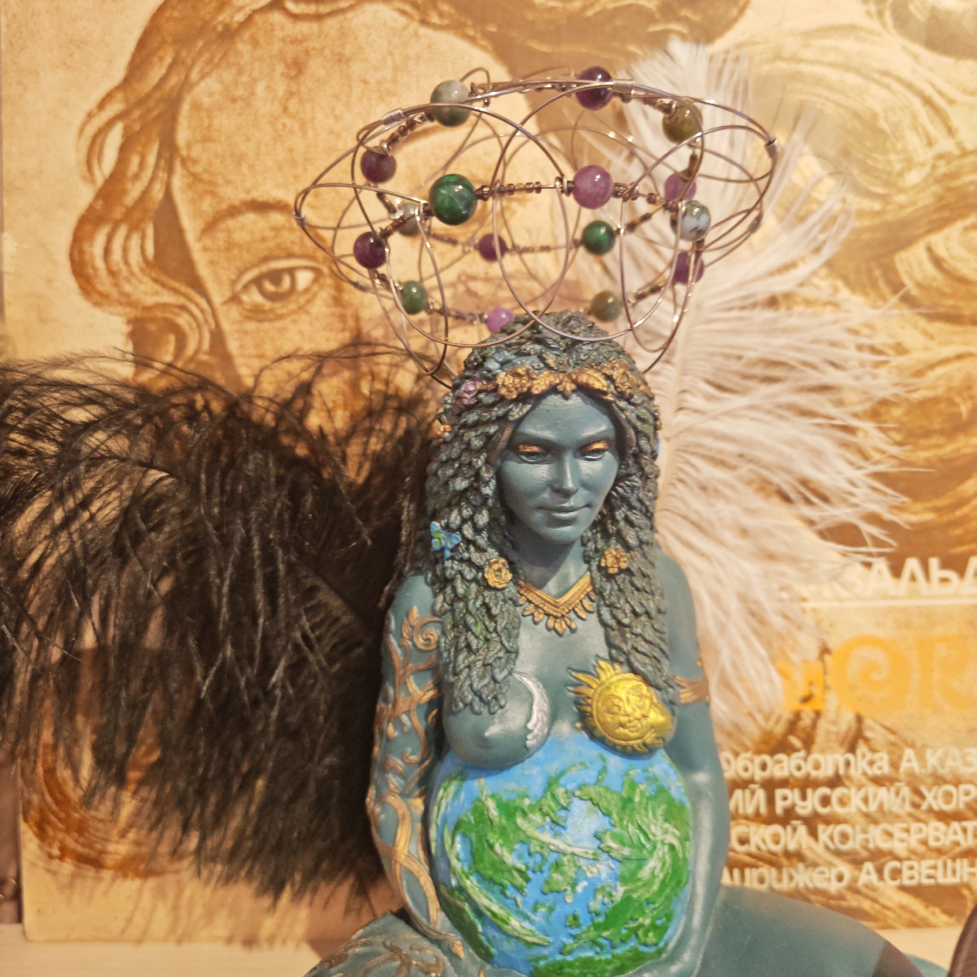 statue of a pregnant, blue-skinned woman representing Earth. The statue is adorned with golden details like a necklace, a headdress of leaves, and symbols of the sun and the moon on her chest. Her pregnant belly is painted to resemble the Earth, with blue oceans and green landmasses. Atop her head is a wire structure with green and purple beads resembling a celestial crown. In the background is a drawing of a person, black and white feathers, and some Russian text. The text includes the words "RUSSIAN CHOIR." I cannot say where this image was taken in Rostov, Russia.