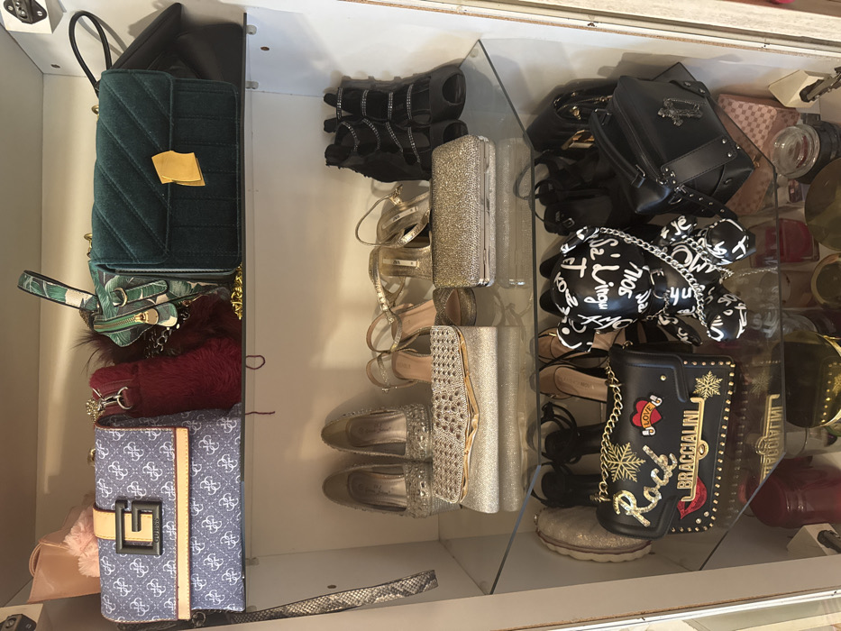The image displays the interior of a brightly lit, white-backed display cabinet or closet with three glass shelves and a solid bottom shelf, organized with various fashion accessories. The specific location within the city of Plovdiv, Bulgaria, cannot be determined from the provided image, which depicts an indoor setting. On the uppermost solid shelf, from left to right: a light blue Guess handbag with a repeating "G" logo pattern and a prominent gold-colored "G" clasp on a light brown strap is visible. Behind it, a soft pink item is partially obscured. Next, a small, deep red, textured bag or charm is present, followed by a dark green bag with a tropical leaf pattern. To the right, a dark teal/emerald green quilted handbag featuring a distinct gold-colored metal clasp is displayed. A plain black handbag is partially visible further to the right. A long, thin, patterned strap, resembling snakeskin print, hangs vertically down the left side, extending to the shelf below. The second, glass shelf features, from left to right: two silver-colored high-heeled shoes, possibly pumps or wedges, with embellished surfaces, positioned facing the rear of the cabinet. In the center, two glittering silver-colored clutch bags are arranged; the left clutch has a textured, possibly reptilian pattern on its flap and rests on a larger, simpler glittering silver clutch, while the right clutch is a rectangular, simpler glittering silver design. To the right, two pairs of high-heeled shoes are visible: one pair of strappy gold-colored sandals and one pair of black open-toed ankle boots with multiple silver-colored rhinestone straps. On the third, glass shelf, from left to right: a pair of light-colored, possibly beige or silver, flat shoes or slippers are on the far left. Next, a black handbag with gold studs, an embroidered "Rock" in gold, a red heart emblem, and a gold "BRACCIALINI" plaque is centrally placed, featuring a gold chain strap. Behind it, several pairs of dark-colored high-heeled sandals or shoes are partially visible. To its right, a black bear-shaped figure, possibly a decorative item or bag, is covered in white graffiti-style text and adorned with a silver-colored chain. Further to the right, a structured black handbag with silver-colored studs and a silver-colored cross emblem is visible. A light pink or beige patterned box or object is partially obscured behind this handbag. The bottom shelf, partially visible, contains various dark-colored, indistinct objects, including red cylindrical containers on the left, a reflective gold-colored object in the center, and a dark, clear container with a lid on the right. No people are present in the scene, and all depicted objects are static.