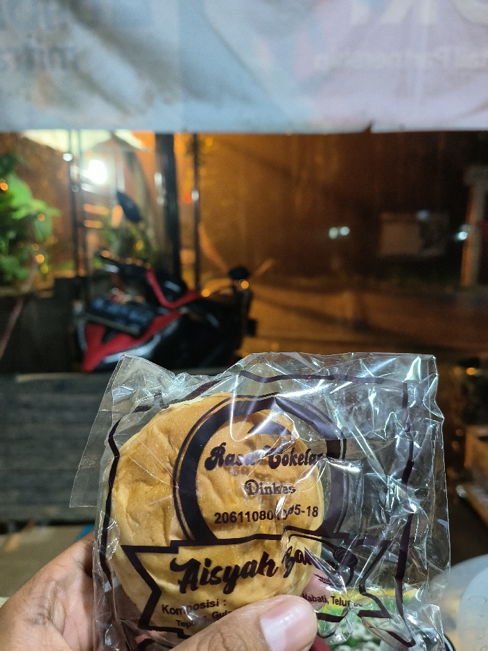 A close-up, low-light image captures a human hand holding a packaged bun at night in Lhokseumawe, Indonesia. The hand, visible with an exposed thumb and fingers, supports a clear plastic-wrapped, round, light-brown bun. The packaging displays Indonesian text in a dark brown or black font, reading "Rasa Cokelat" (Chocolate Flavor), "Dinkes 20611080XXXX-18" (Department of Health registration number), "Aisyah B..." (likely a brand name like Aisyah Bakery), and "Komposisi : Tepung, Gu..., N..., Telur..." (Ingredients: Flour, Sugar..., Vegetable..., Egg...). The immediate background is blurred, showing a red and black scooter or motorcycle parked on what appears to be a paved surface, illuminated by a bright artificial light source, possibly a streetlamp, to the left. Further background elements include indistinct vegetation, a dark roadway, and distant, faint artificial lights. A light-colored banner or tarp hangs in the upper background. The scene is illuminated by artificial light, suggesting nighttime conditions.