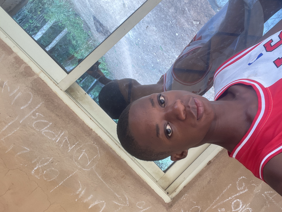 A young, dark-skinned male is positioned indoors in Akawa, Nigeria, facing forward with a neutral expression. He wears a red and white sleeveless basketball jersey featuring a dark logo on the left chest. To the subject's left, a light brown wall exhibits white chalk inscriptions, including "VIC," "10B21," and "@NPPS/UN." To the subject's right, a window with a light-colored frame reflects the subject's back, while simultaneously revealing an outdoor scene through the glass. The exterior view includes a dirt ground surface and green vegetation.