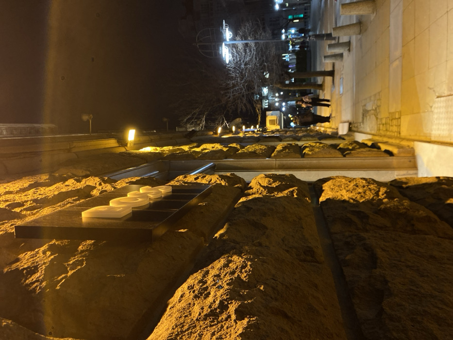 The image depicts a nighttime street scene in Sofia, Bulgaria, characterized by strong artificial illumination. The left foreground is dominated by a rough-hewn, yellowish-brown stone facade, illuminated by warm-toned lights. A dark rectangular sign, bearing partially visible raised white letters that appear to spell "Loo...", is mounted on this stone wall. A series of identical wall-mounted lights are visible further down the building. The adjacent sidewalk, paved with light-colored square and textured slabs, extends from the immediate foreground into the midground. Two individuals are positioned on the sidewalk in the midground, facing each other, possibly engaged in conversation. One person wears dark clothing, while the other appears to have lighter attire or is holding a light-colored object. A third individual is seen walking away further down the sidewalk. Several bare-branched trees are planted along the sidewalk, consistent with a winter or late autumn season. To the right of the sidewalk, a street or pedestrian zone is visible, demarcated by several cylindrical, light-colored bollards. A tall streetlamp with a distinctive, decorative, cage-like top structure illuminates the street in the mid-distance. Additional streetlights and buildings with illuminated windows are visible in the background, suggesting a bustling urban environment. The sky is dark, indicating the scene is captured after dusk.