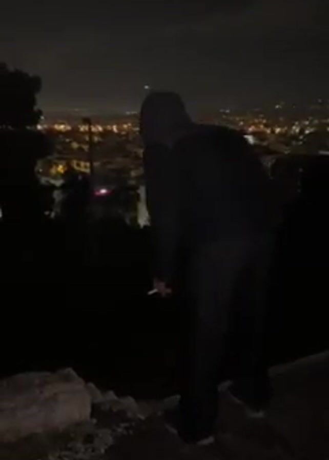 A person, silhouetted against a nighttime city view, stands at the edge of a hill. The person wears a dark hooded sweatshirt and dark pants. The city lights twinkle in the background. The person appears to be holding a cigarette and is looking down into the darkness below. There are trees and some stone structures near the person. The sky is dark with some cloud cover. The camera angle is from slightly below the person, looking upwards towards the city.