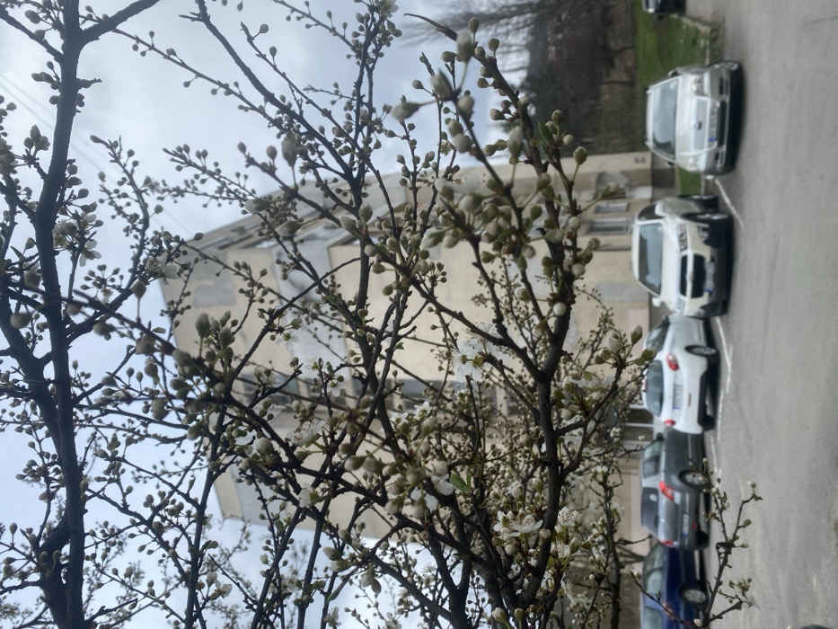 The scene depicts an outdoor urban environment in Kyustendil, Bulgaria, confirmed by the "CB" prefix on a vehicle's license plate. The foreground is dominated by a dense network of leafless tree branches, heavily covered with numerous closed white flower buds and a few small open white blossoms, rendered in shallow depth of field. Below and behind these branches, a paved parking area is visible, containing several parked automobiles: a dark hatchback (partially visible), a grey Suzuki Swift, a white Peugeot 208, a cream Chevrolet Captiva SUV, and a silver Toyota Avensis sedan displaying Bulgarian license plate CB 1928 HP. In the background, a multi-story, light-colored apartment building with a weathered exterior and visible windows stands. Further back, a natural slope with sparse, dormant vegetation is present under a uniformly overcast sky. No individuals or active interactions are observed.
