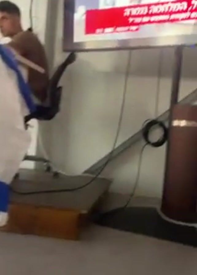 person sitting at a desk covered with an Israeli flag and watching a news broadcast on TV. The news anchors are reporting on a war, with the text “טראמפ: זה יום גדול, המלחמה נגמרה” visible on the screen. The video appears to be taken from a low angle.