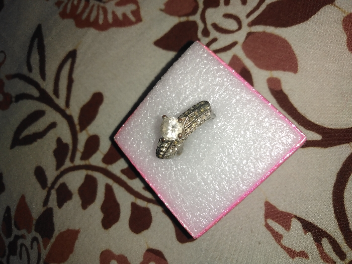 - "A silver-colored ring with a large, round, clear central gemstone and numerous smaller clear gemstones set in an ornate, possibly braided band, rests on a white, textured foam insert within a small, open rectangular box featuring pink edges" by FM-9dzTh2, licensed under CC BY 4.0