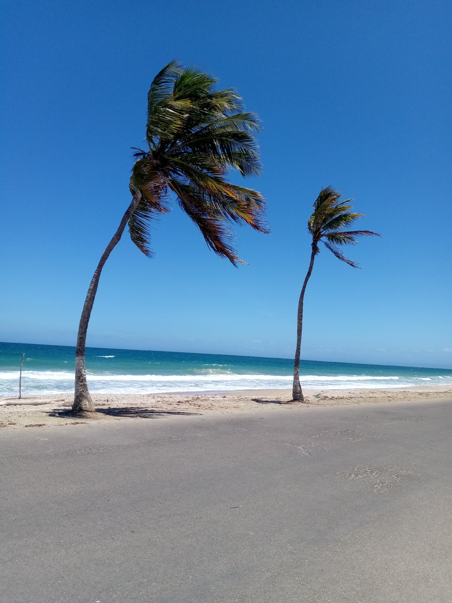 The image displays a bright, clear daytime coastal scene in Porlamar, Venezuela. The foreground consists of a grey asphalt road, granular in texture and devoid of markings or vehicles. Beyond the road, a sandy beach extends towards the ocean. Two palm trees are prominent features on the beach. The larger palm tree on the left has a thick, slightly curved trunk, partially marked with white paint, and its green and brownish fronds are visibly being blown to the right by wind. The second, smaller palm tree on the right has a slender, straighter trunk, and its green fronds also exhibit movement to the right. Both palm trees cast distinct shadows onto the sand. A thin, light-colored vertical stake is present in the sand near the base of the left palm tree. The beach meets the ocean, characterized by turquoise and blue water with white-foamed waves breaking along the shore. The horizon is visible in the distant background. The sky is a uniform, deep blue, completely free of clouds. No individuals are present in the frame.