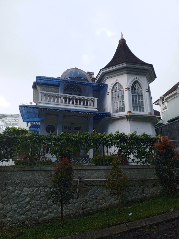 The image depicts a multi-story house, reportedly located in Weintiapa, Liberia, viewed from a street-level perspective under an overcast sky. The house features an eclectic architectural style, predominantly white with light blue trim and darker blue roof elements. On the right, an octagonal turret with a dark, conical roof, topped by a finial, presents two tall, arched windows framed in white with gold-colored accents. The central upper floor includes a balcony with white classical balustrades featuring gold-colored caps, situated beneath a blue dome structure and a semi-circular arched window. A light blue-framed awning extends over the balcony. The first floor, partially obscured by foliage, features a circular window and an entrance area, also covered by a matching light blue-framed awning. The property is elevated from the foreground by a grey stone retaining wall with a textured concrete band above it. A dark metal fence runs along the top of this wall, supporting a dense layer of green foliage, possibly a vine or hedge, which obscures the lower portion of the house. In front of the retaining wall, several small, narrow bushes with reddish-green leaves are visible. The immediate foreground shows a strip of green grass and the dark, paved edge of a road or sidewalk. A light-colored utility pipe is affixed to the retaining wall on the right. No individuals are present in the scene.