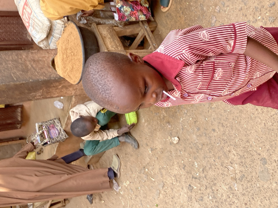 A child with a lollipop stands next to a person selling goods from a market stall. The stall includes a tray filled with a granular material, possibly grain or spices. Another child sits nearby, seemingly engaged with something on the ground. The scene appears to be set in an outdoor marketplace with a dirt or uneven ground surface. The first child is wearing a red and white striped shirt, while the seated child is dressed in green pants and a beige top.