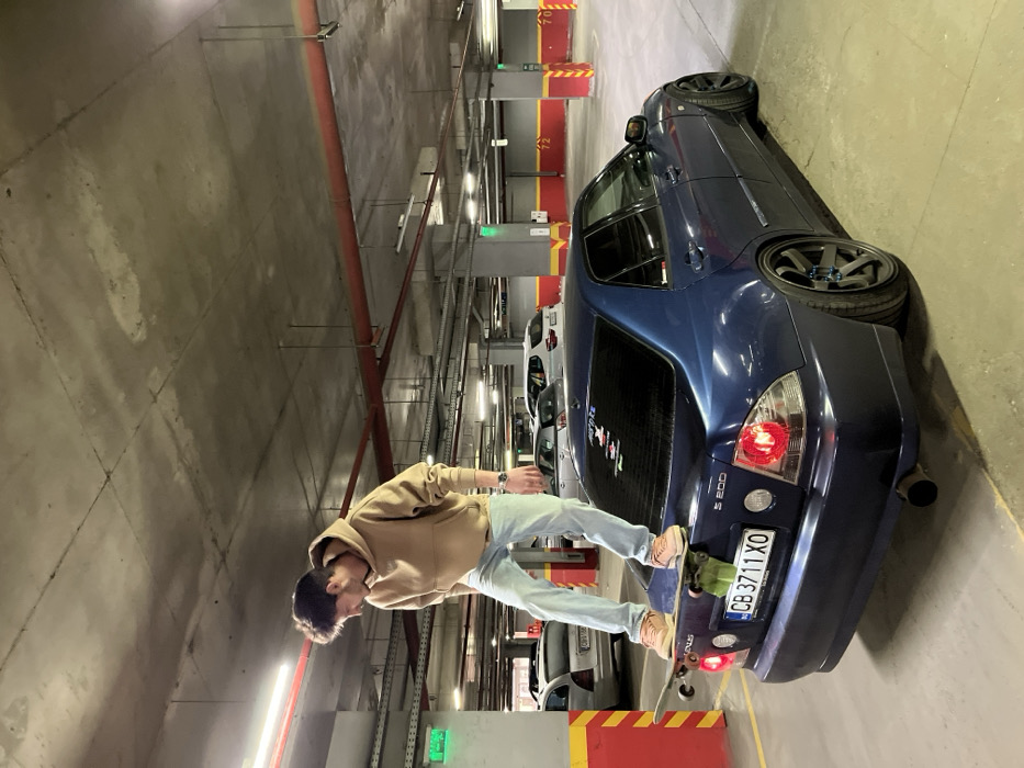 An indoor parking garage in Sofia, Bulgaria, provides the setting for a young adult male balancing on a skateboard placed atop the trunk of a dark blue Lexus IS 200 sedan