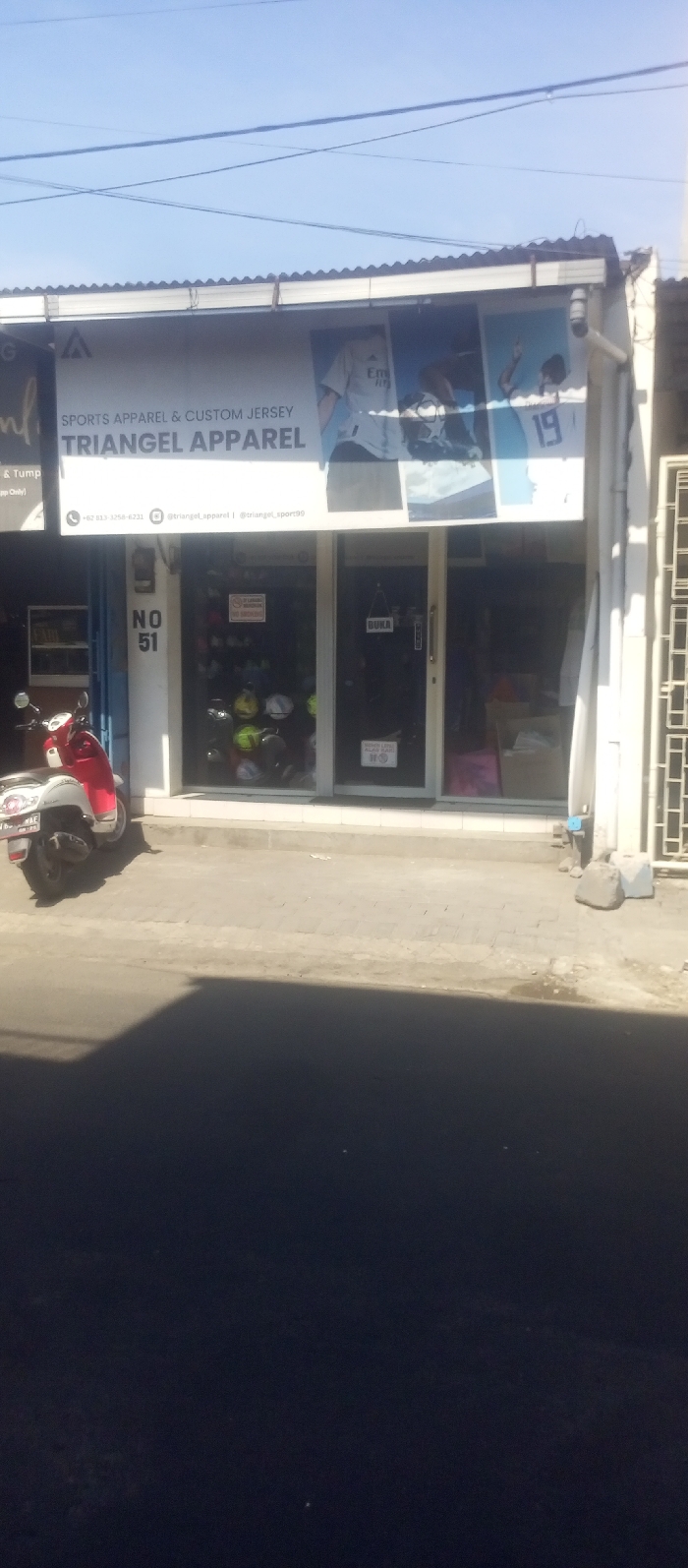 The image displays the exterior of the "TRIANGEL APPAREL" store, located at "NO 51" in Wedoro, Indonesia, under a clear, bright blue sky