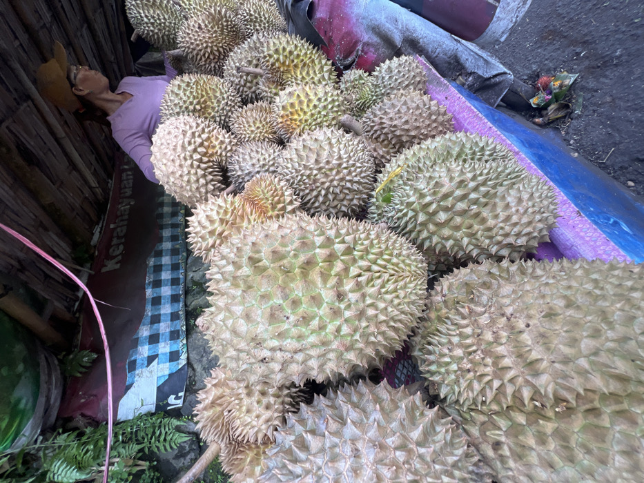 An outdoor vendor stall in Ambengan, Indonesia, is depicted, featuring a substantial quantity of durian fruits