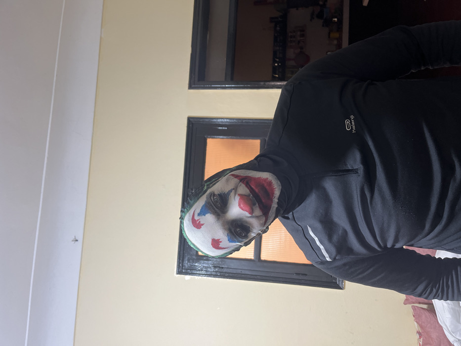 The scene depicts an interior room in Ouaouizert, Morocco. A single adult male individual is prominently featured, positioned from the mid-torso upward, with his head tilted slightly to the left. He wears theatrical face paint, characterized by a white base covering his face, a broad red smile extending from his mouth, a red circular nose, and blue diamond shapes applied above and below his eyes. Green hair is visible on his scalp. He is dressed in a black, long-sleeved athletic shirt with a quarter-zip collar, featuring white reflective stripes on the left shoulder and a "Kalenji" brand logo on the chest. His gaze is directed forward, engaging the viewer. The background consists of plain light yellow walls with a white ceiling trim. A dark-framed window with an orange-tinted pane is visible behind the individual's left side. To his right, a dark-framed doorway opens into an adjacent, dimly lit room, where dark shelving and indistinct objects can be partially discerned, consistent with a kitchen or utility area. A light-colored fabric or cushion is visible in the lower-left foreground. A small, dark insect is present on the ceiling in the upper-center portion of the frame.