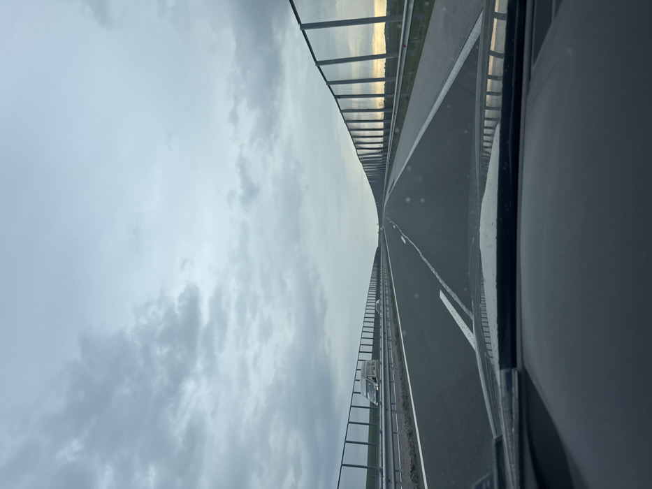 The image depicts a multi-lane highway in the vicinity of Chokoba, Bulgaria, viewed from the interior of a vehicle looking forward through the windshield. The sky is overcast with gray clouds, suggesting diffused lighting, possibly late afternoon or early evening, with a subtle warmer light visible on the horizon to the far right. The asphalt road features two visible lanes in the direction of travel, marked with white solid and dashed lines. A hard shoulder is present on the right. Tall sound barrier walls, constructed with dark frames and translucent or reflective panels, line both sides of the highway, extending into the distance and curving with the road. Metal guardrails are situated beneath the sound barriers. Beyond the barriers, green grassy areas are visible. One white van, possibly a camper or delivery vehicle, is observed in the left lane at a significant distance ahead. A smaller, dark-colored vehicle is less distinctly visible further ahead in the right lane. No individuals are discernible in the scene. The dashboard or top of the hood of the viewpoint vehicle is visible in the lower portion of the frame.