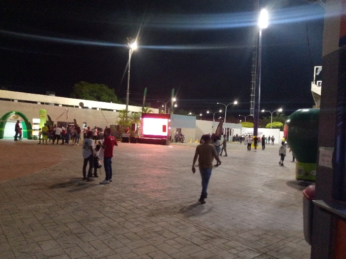 The image displays an outdoor public or event area at night in Porlamar, Venezuela, illuminated by artificial light sources