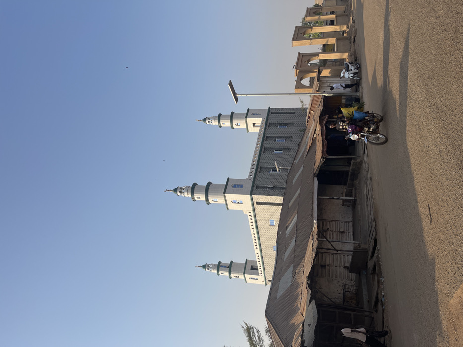 A white mosque with three minarets stands tall against a clear blue sky. Adjacent to the mosque, there is a weathered roadside structure with a corrugated iron roof. A motorbike is parked nearby on an asphalt road. The surrounding area includes residential buildings in the background. The scene is captured during daylight, with visible shadows.