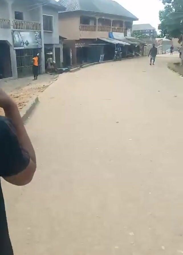 person walking on a paved road in a residential area. The road is mostly empty except for a few people walking in the distance. There are buildings on either side of the road, some with shops. The sky is overcast.