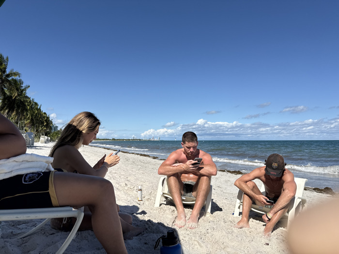 The image displays a sunny beach scene in Key Biscayne, United States. Four individuals are present, seated in white beach chairs on light-colored sand, facing the ocean. On the far left, a person's lower torso and legs are visible, wearing dark shorts with a white towel draped on their lap. Adjacent, a young adult female with long blonde hair sits, looking down at a smartphone held with both hands. To her right, a shirtless young adult male with short hair sits, also focused on a smartphone. Further right, a second shirtless young adult male, wearing a dark baseball cap, sits, similarly engrossed in a smartphone. A small, light-colored bottle is on the sand near the female, and a blue water bottle is in the lower-left foreground. The ocean has small waves and visible seaweed. A line of tall palm trees borders the beach on the left, and a distant cityscape is visible across the water. The sky is clear blue with scattered white clouds.