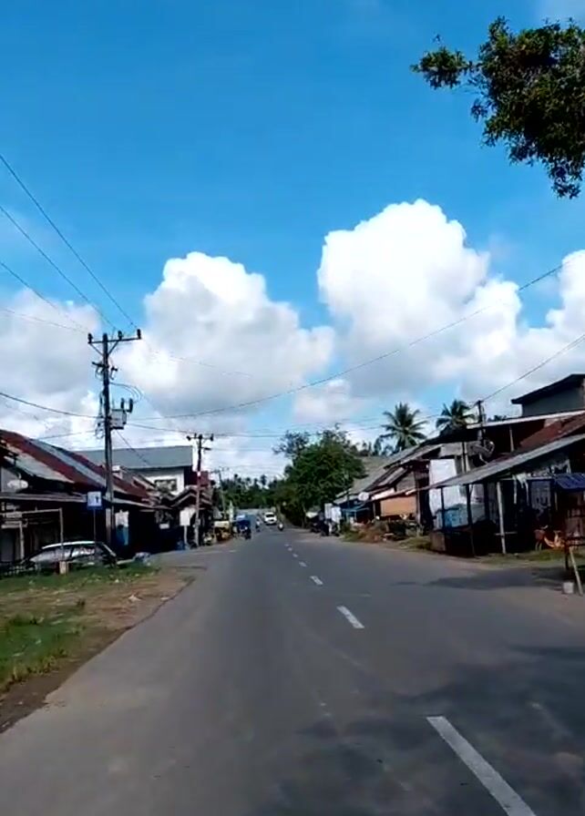 view from a vehicle traveling down a straight road in what appears to be a small town or village. The road is paved and has double white lines in the center. On either side of the road are buildings, mostly one-story structures, some with metal roofs. Power lines run above the road, supported by utility poles. The sky is blue with scattered white clouds. A few vehicles, including a car and some motorbikes, can be seen in the distance and parked along the roadside. There is a green tree to the right of the frame. The overall scene depicts a quiet, rural street on a sunny day.