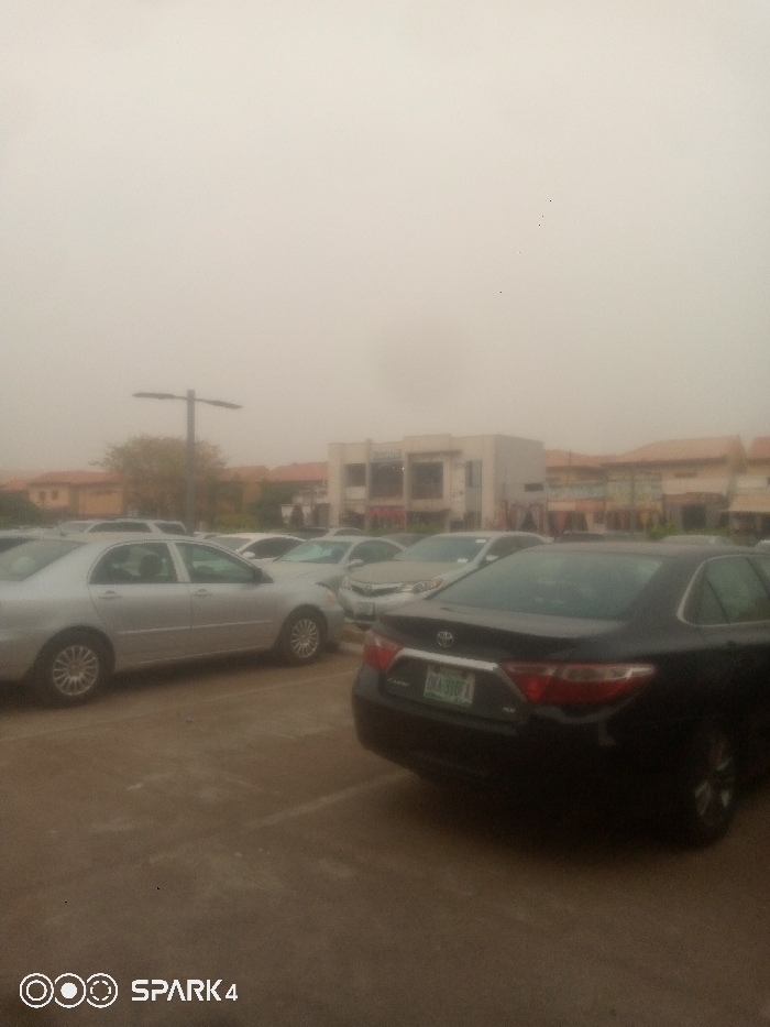 A parking lot filled with cars. The foreground features a black sedan with visible license plate. A silver sedan is parked next to it. More cars fill the spaces behind. Buildings are visible in the background, their details obscured by the haze. A street lamp stands tall among them. The sky is a uniform grey, indicative of dusty conditions. "SPARK 4" is branded at the bottom.
