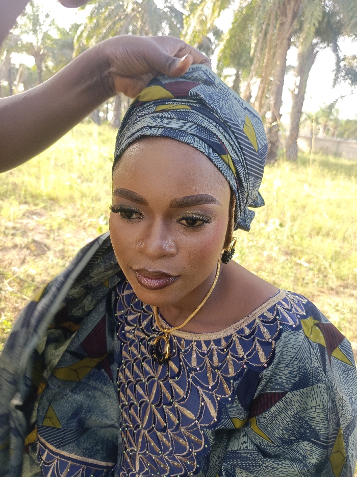 An outdoor scene in Doma, Nigeria, depicts an African female from the mid-torso up, facing slightly right and looking downward. She has a full face of makeup, including green eyeshadow, defined eyebrows, and dark rose-toned lipstick. A dark-skinned hand is visible in the upper left, adjusting a multi-patterned headwrap, which bears the text "VERITABLE WAX HOLLANDAIS," on her head. The female wears a traditional blue garment with elaborate gold-threaded embroidery and light-colored beadwork around the neckline. She is accessorized with a thin gold-colored chain necklace featuring a black and gold pendant, and large black beaded hoop earrings. The background consists of dry, light-colored grass, multiple palm trees, and a faint light-colored fence or structure under natural daylight.