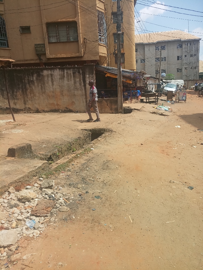 The image depicts an unpaved street scene in Onitsha, Nigeria