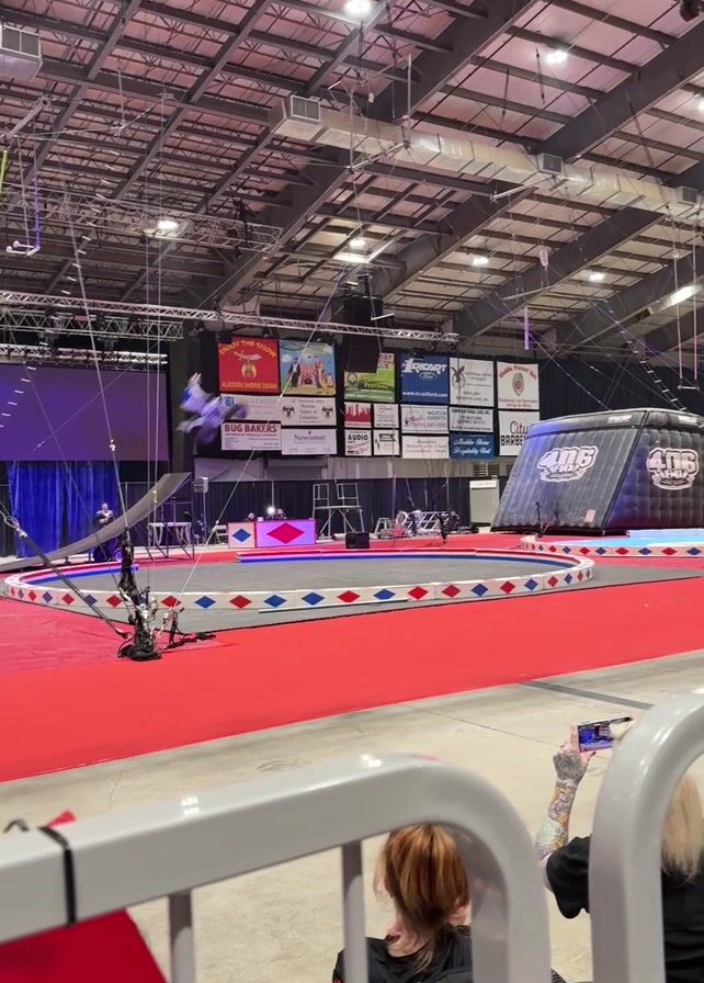 freestyle motocross stunt performed at an indoor arena, likely during a circus or similar event