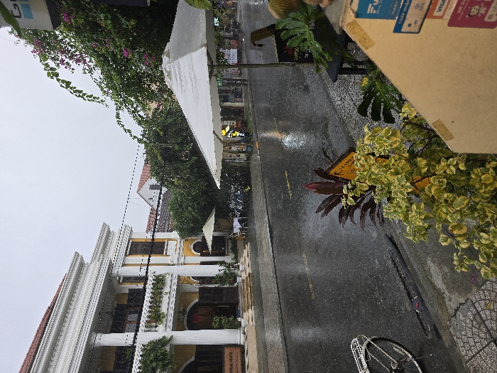The scene depicts a street in Hội An Ward, Vietnam, on an overcast, rainy day. The asphalt road surface is thoroughly wet, displaying reflections and minor splashing, with faint yellow markings visible. On the left side of the image, a tiled sidewalk borders a large, two-story building exhibiting colonial architecture. This building features a yellow facade, prominent white columns supporting a balcony, and ornate white cornices under a red-tiled roof. A sign partially legible as "CENTRAL HO..." is affixed to its ground floor. An outdoor dining area with tables, chairs, and a smaller cream-colored umbrella is situated in front of the building. Several bicycles or motorbikes are parked near this area. A portion of a bicycle wheel is visible on the far left foreground. Overhead power lines span the street in the mid-ground. On the right side of the image, the foreground features a light-colored, angular object or package displaying multiple payment method stickers, including "FPT," "VISA," and a QR code. In front of this object are dense green and yellow variegated foliage, followed by a plant with dark red leaves. Behind these plants, a large, white market umbrella, visibly wet, extends over a section of sidewalk with a dark bench. Beyond the umbrella, partially obscured storefronts and a building draped with green vines and pink flowers are visible. No individuals are present or engaged in any discernible actions within the frame. The environment is consistent with an urban setting experiencing precipitation.