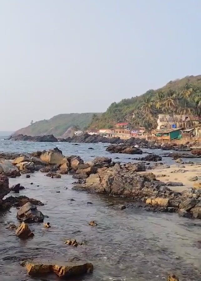 rocky beach with calm waters in front of some buildings and a hillside. The water is shallow and clear, with rocks of various sizes scattered across the foreground. In the background, there is a sandy beach area with buildings, some appearing to be cafes or restaurants, along the coastline. A hillside covered with trees, including palm trees, rises behind the buildings. The sky is overcast, casting a soft light on the scene. The camera appears to be stationary.