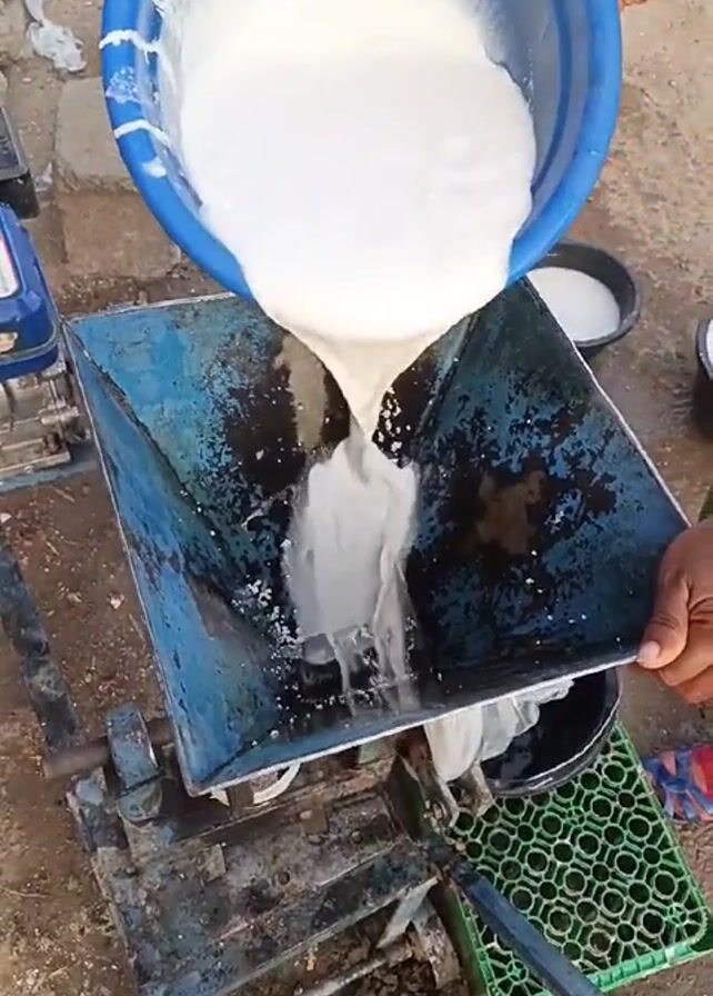 A woman is pouring a white liquid from a blue bucket into a metal machine. The machine has a funnel-shaped top and sits on a metal frame. There is a black bucket underneath the machine to catch the liquid as it comes out. The woman is wearing a yellow t-shirt, a green apron, red socks, and sandals. She has her hair in braids. A small child is standing near her. The scene is set in a public area, possibly a market or street, with buildings and vehicles visible in the background.