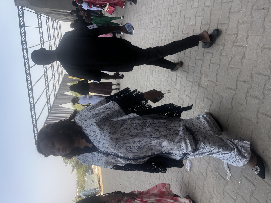 The image depicts an outdoor scene in Iddo Tudunwada, Nigeria, on a clear, bright day. The foreground features a woman of apparent African descent, with shoulder-length curly dark hair, walking from left to right. She wears a full-length, loose-fitting kaftan-style garment with a white and black speckled pattern and solid black lace trim on the sleeves and V-neckline. Her left hand holds a smartphone and a string of beads, while her right hand is not visible. She wears black pointed-toe flat shoes with a decorative silver buckle. Her expression appears neutral or slightly downcast. Behind her, a man of apparent African descent walks in the same direction, his back to the camera. He wears a loose-fitting black short-sleeved top with two horizontal white stripes on the upper left arm, and black trousers. He holds a plastic water bottle in his right hand. His footwear consists of dark slip-on shoes, with his left foot appearing partially out of the shoe. In the mid-ground and background, other individuals are visible, also walking or standing. Many are dressed in traditional Nigerian attire or casual wear. The environment includes a light-colored paved ground surface, likely interlocking bricks. Overhead, a metallic skeletal structure with cross-bracing suggests an open-air walkway or shelter. In the far background, a hazy skyline shows sparse buildings and vegetation under a bright sky, characteristic of an urban or semi-urban setting. Debris, possibly a discarded tissue, is visible on the ground near the woman's left foot.