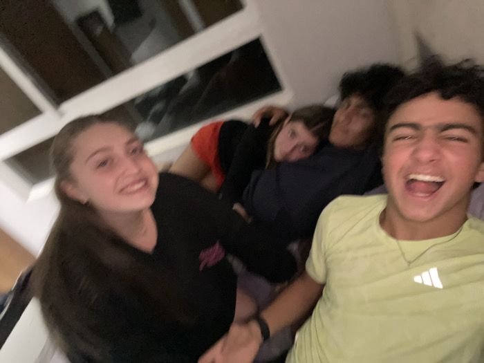 A group of four young people pose for a selfie. A girl with long brown hair in a black t-shirt smiles at the camera. Behind her, a girl in a black top and red shorts is nestled in the group. A young man with dark curly hair looks at the camera. In the foreground, a young man in a light green t-shirt is laughing with his mouth open. They are indoors, with a window visible in the background. The image has a candid, informal feel.