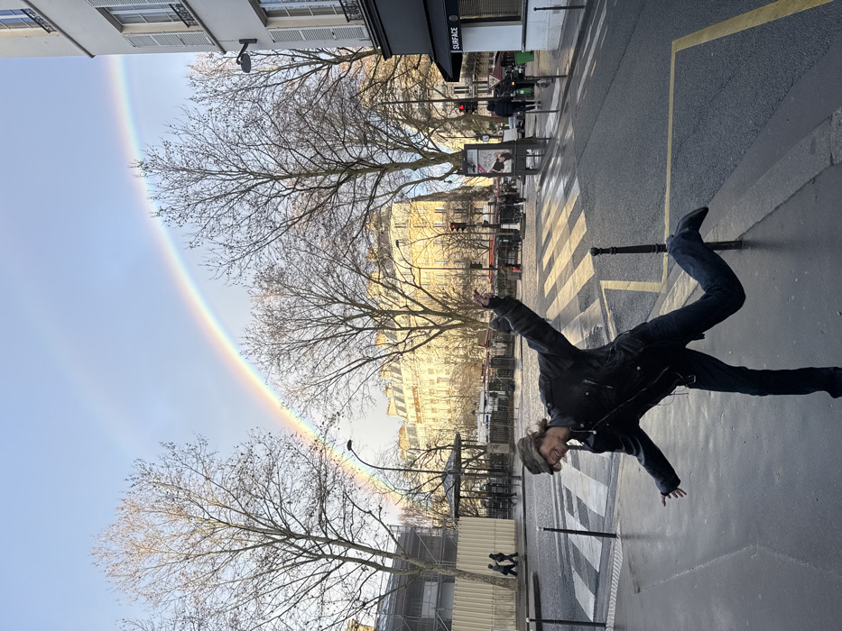 A rainbow arcs across a Parisian street scene. Bare trees flank the sides of the rainbow, framing buildings in the background. A pedestrian crossing stretches across the street. A person in jeans and a black jacket poses dramatically, seemingly in mid-air. The street appears wet, reflecting light. The scene is oriented vertically, as if the image was taken with a phone and is rotated to a portrait format.