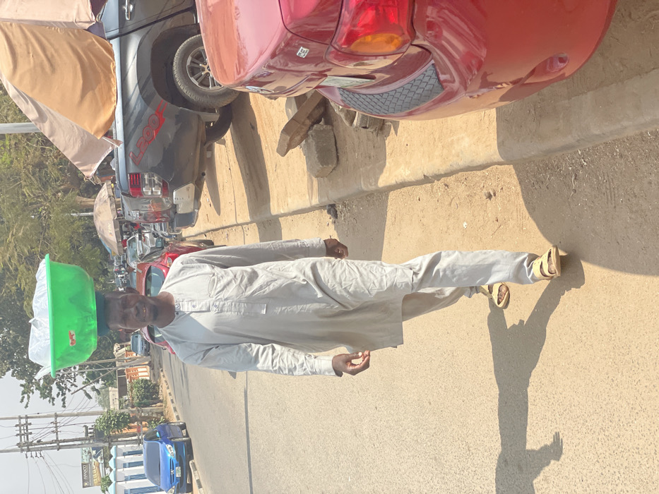 n adult male walking on the unpaved shoulder of a paved road in Abuja, Nigeria