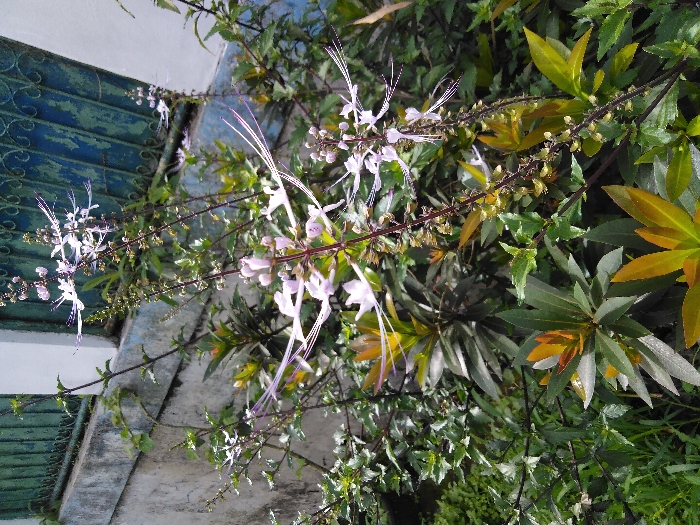 The image presents a dense botanical scene in Phouviang-Gnai, Laos. The primary subjects are multiple stalks of *Orthosiphon aristatus* (Cat's Whiskers plant), prominent in the central and right portions of the frame. These plants exhibit slender, dark stems adorned with numerous light purple-white tubular flowers, each featuring distinctively long, white, whisker-like stamens. Surrounding these flowering plants is a variety of dense green foliage, including some plants with oblong dark green leaves and others displaying new growth with striking reddish-orange or bronze hues. In the upper left background, a segment of a light-colored concrete wall is visible. To its right, and spanning the upper background, is a weathered, turquoise-green painted metal grate or gate, distinguished by an ornate scrolled design and significant paint degradation showing chips and peeling. The scene is brightly illuminated, indicating direct daylight. No human subjects or active interactions are visible.