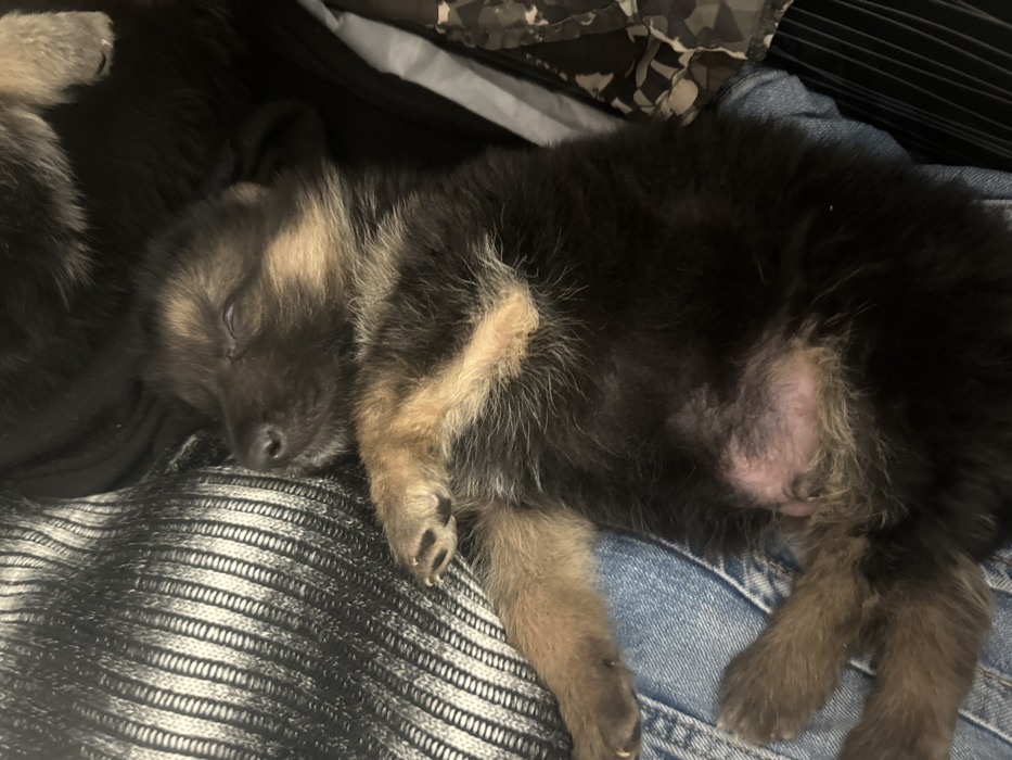 A juvenile canine, consistent with a German Shepherd puppy, is depicted lying supine on a person's lap