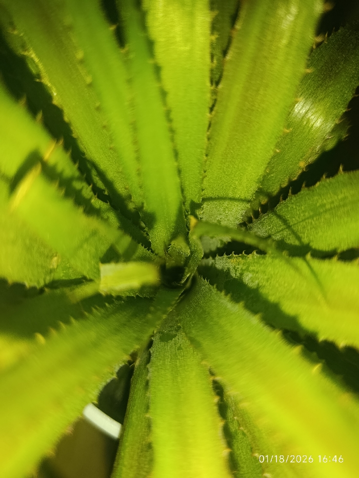 The image displays a top-down, close-up perspective of a plant located in the city of Bekabad, Uzbekistan. The central subject is a rosette-forming plant characterized by numerous thick, succulent-like leaves radiating outwards from a central core. The leaves are predominantly vibrant green, featuring yellowish-green illumination highlights and distinctively serrated margins. No human subjects are visible within the frame. A partial view of an opaque white object, consistent with a plant pot or container, is observable beneath the foliage towards the bottom-center. The immediate background is dark and out of focus, indicating a macro shot or controlled lighting environment. A digital timestamp "01/18/2026 16:46" is embedded in the bottom right corner of the image.