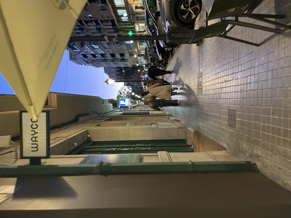 The image depicts an urban street scene at dusk in València, Spain, specifically on Carrer de l'Almirall Cadarso, near the Wayco Ruzafa coworking space. The perspective is from a low vantage point on the sidewalk, looking down the street. On the immediate left, a building facade features a cream-colored exterior with a green vertical drainage pipe and a closed, dark green double door. Above, a white rectangular sign with black lettering reads "WAYCO". The foreground on the right side shows a partial view of a cream-colored outdoor awning. Below the awning, two dark-colored outdoor chairs are positioned. Adjacent to the sidewalk, a line of parked vehicles, including multiple cars and at least one scooter, extends down the street. The sidewalk is paved with square, light grey tiles, reflecting some artificial light. Four individuals are walking away from the camera on this sidewalk. The two closest are women: one in dark clothing, and another in a light brown or beige long coat. Two more figures in dark attire are visible further behind them. In the midground, various illuminated streetlights and building lights are visible. A blue "P" parking sign is mounted on a pole, and further down the street on the right, a prominent green "FARMACIA" sign with a cross is illuminated. Buildings with multiple stories line both sides of the street in the distance. The sky above transitions from a light blue at the horizon to a deeper indigo, indicating twilight. Artificial light sources cast long shadows of the pedestrians and objects onto the sidewalk.