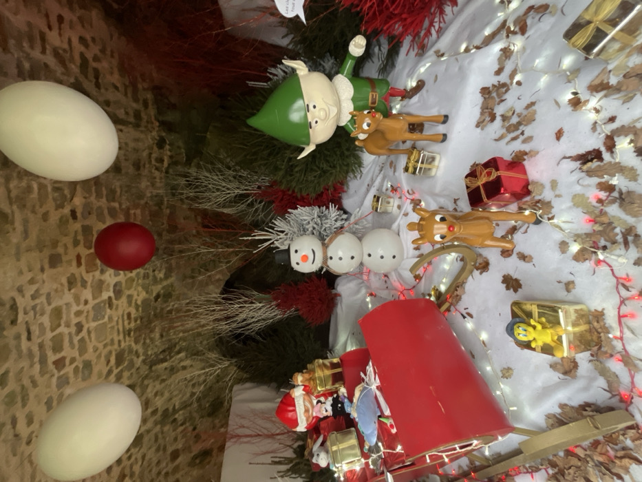This image displays a static Christmas-themed exhibit situated within a stone-arched alcove in Bagnoles de l'Orne Normandie, France