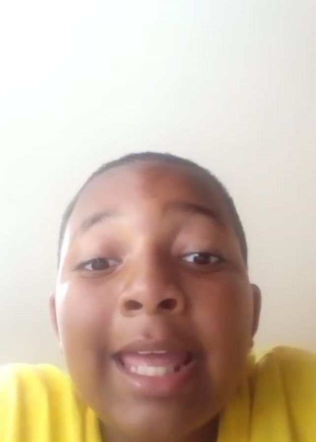 A young boy is holding a camera up to film himself. He wears a yellow shirt and looks up into the camera. He is speaking to the camera. Another person enters the frame briefly at the end of the video. The background is a white or light-colored ceiling.