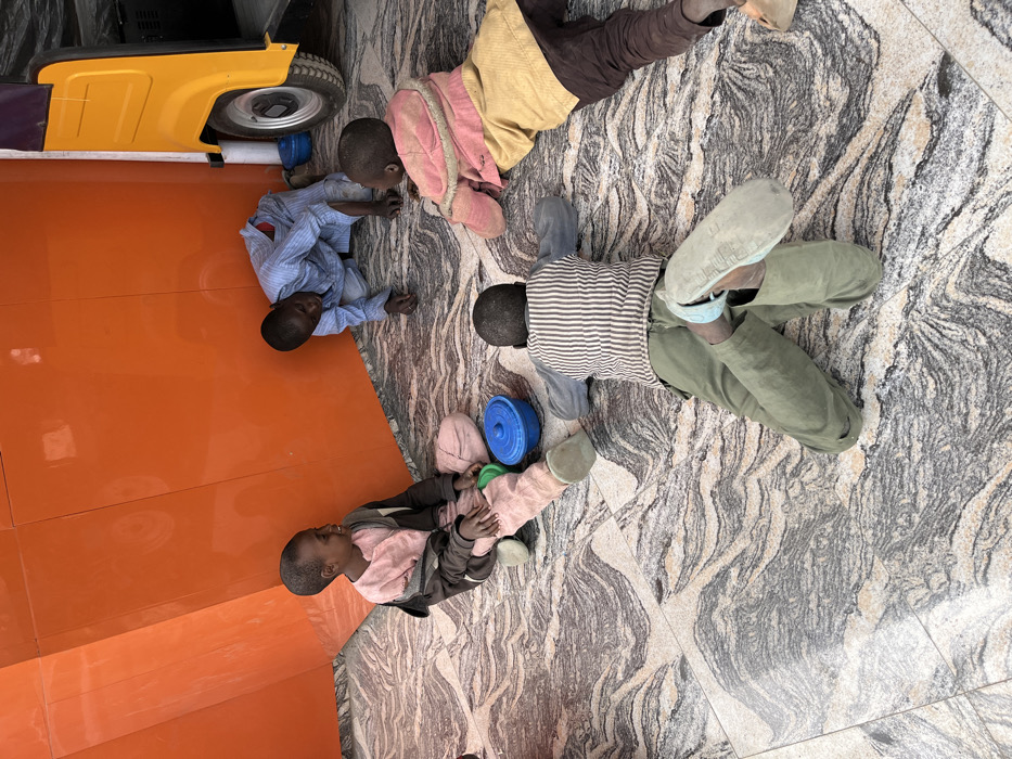 Four children are observed on a patterned grey and white tiled floor in Fagge A, Nigeria, adjacent to an orange-paneled structure